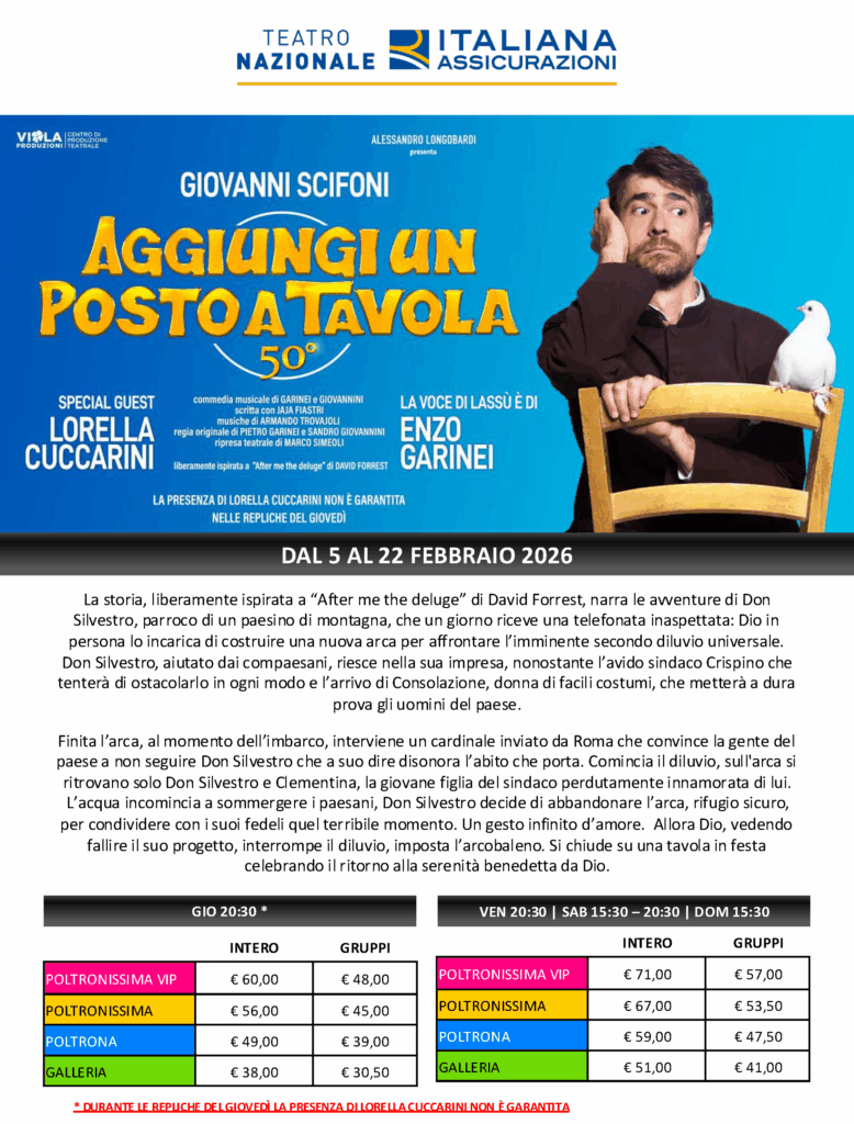 Attenzione, al costo in tabella va aggiunto 1,00 cad. per diritti di biglietteria del teatro.